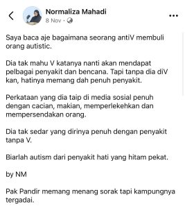 Kepada sesiapa yang mengenali Normaliza Mahadi, sila sampaikan perkara ini kepada beliau; kerana beliau telah menyekat (block) saya, namun dalam masa yang sama berani menulis posting yang memfitnah saya secara terbuka.