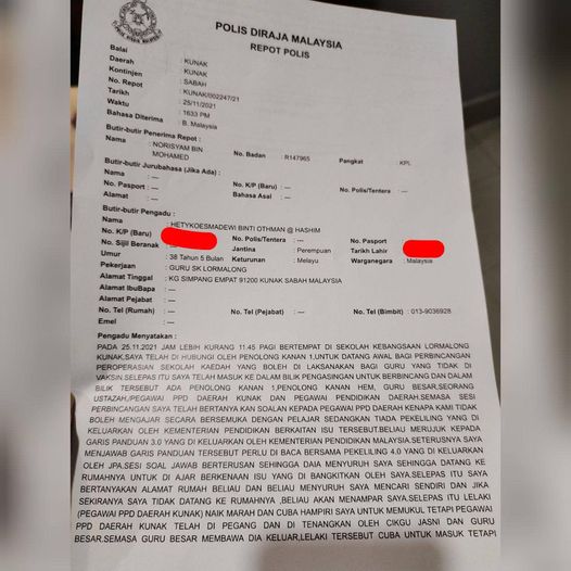 Hari ini satu kes di Kunak, Sabah seorang guru yang menolak vaksin ujikaji diugut dan hampir dikasari pegawai PPD.