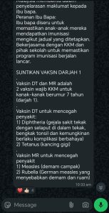 “Vaksin DT dan MR adalah dua vaksin wajib KKM untuk murid Tahun 1.”
